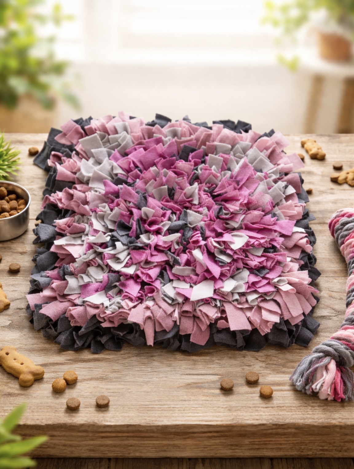 Čmuchací kobereček je ručně vyrobený nejen pro štěňátka, ale je to také vhodný doplněk i pro starší pejsky na zabavení. Do koberečku se můžou dát jak granulky tak různé pamlsky.